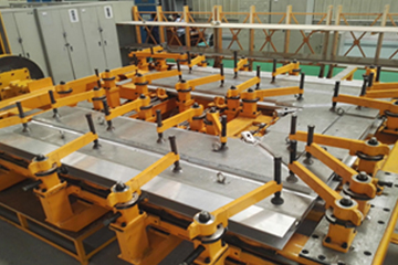 此工裝用于組焊250公里動車3x端墻,采用了旋轉軸絲桿壓緊機構,兩端在工裝的重心位置設計長度可調式變位機接口,可以使工裝在變位機上旋轉和上下移動,使工人操作方便靈活。